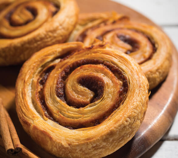 The traditional raisin-bun shape with a cinnamon cream filling, for a subtly spicy taste that goes perfectly with its crispy, golden texture.
